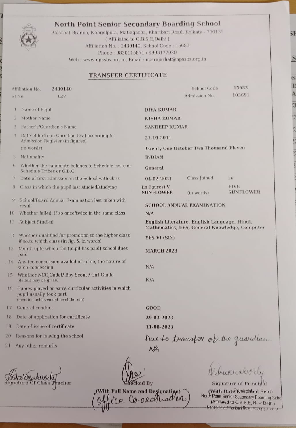 Transfer Certificate