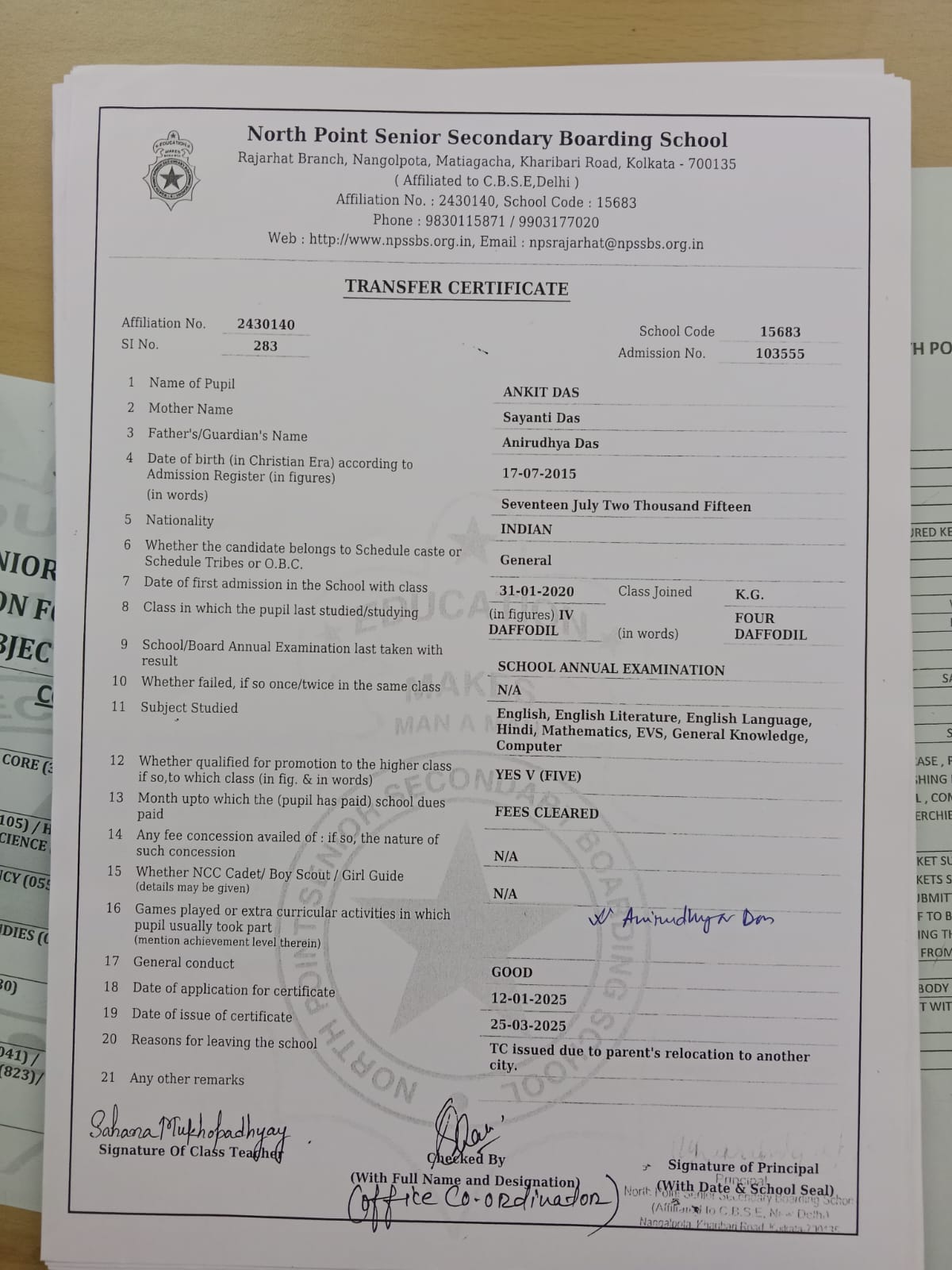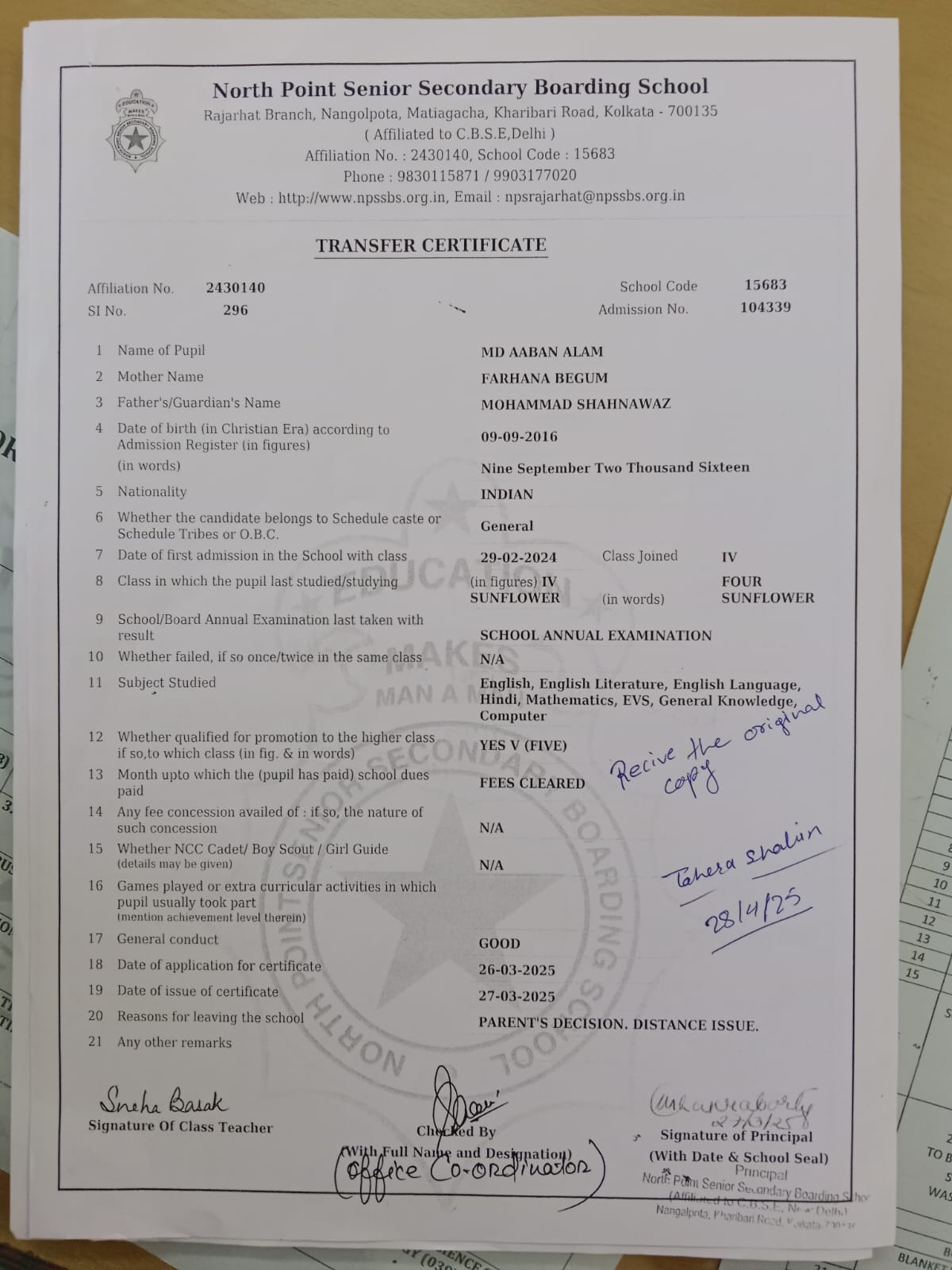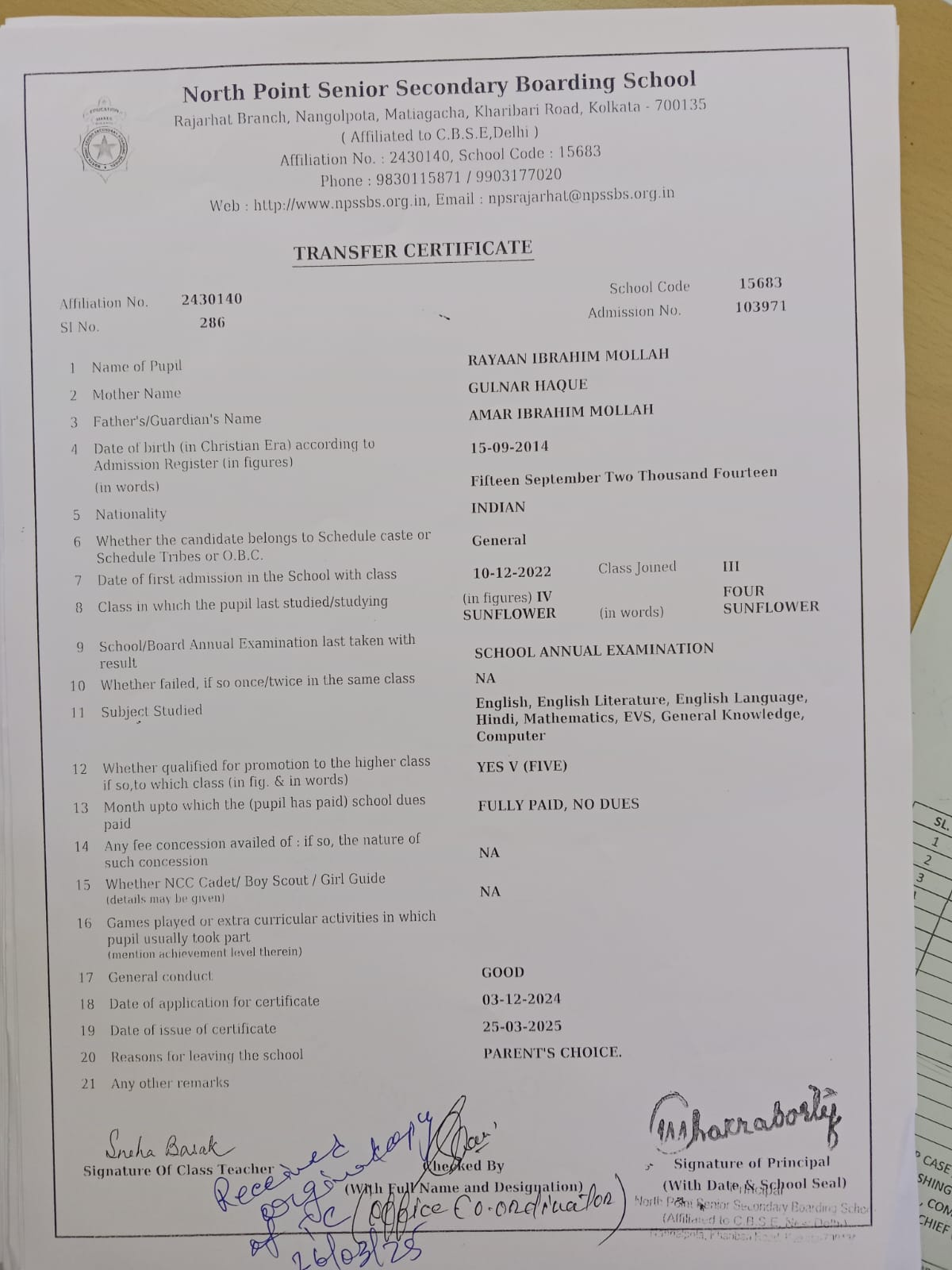 Transfer Certificate