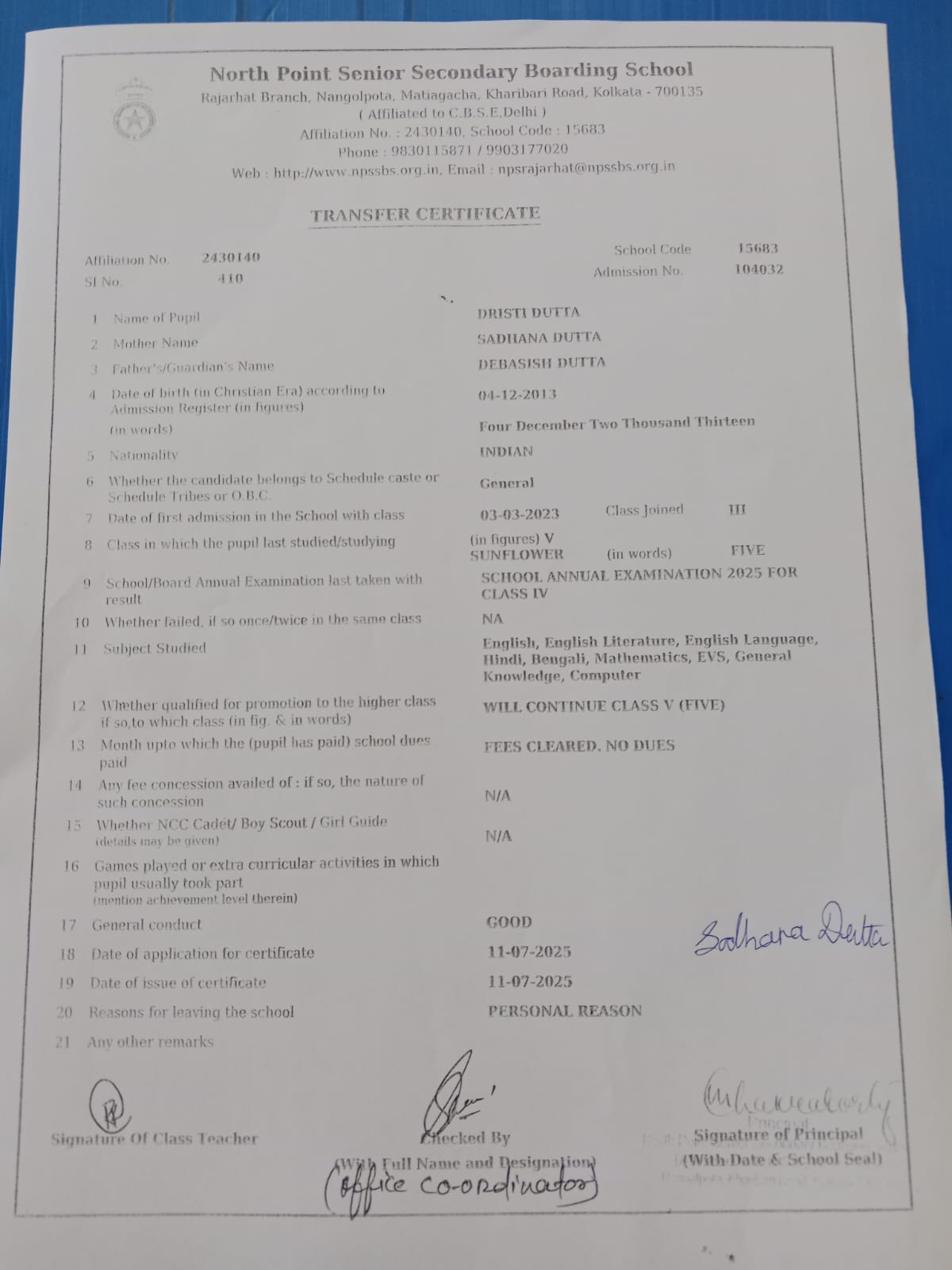 Transfer Certificate
