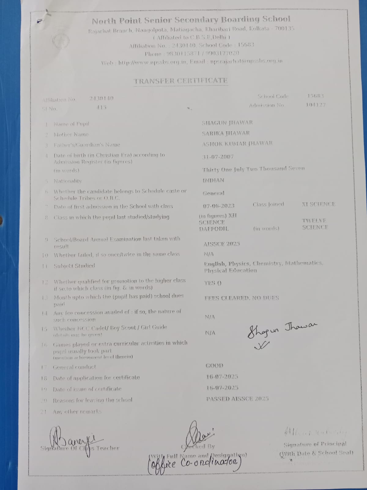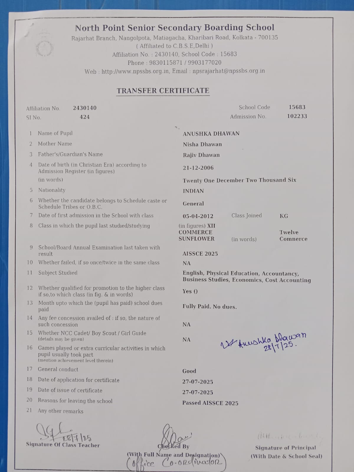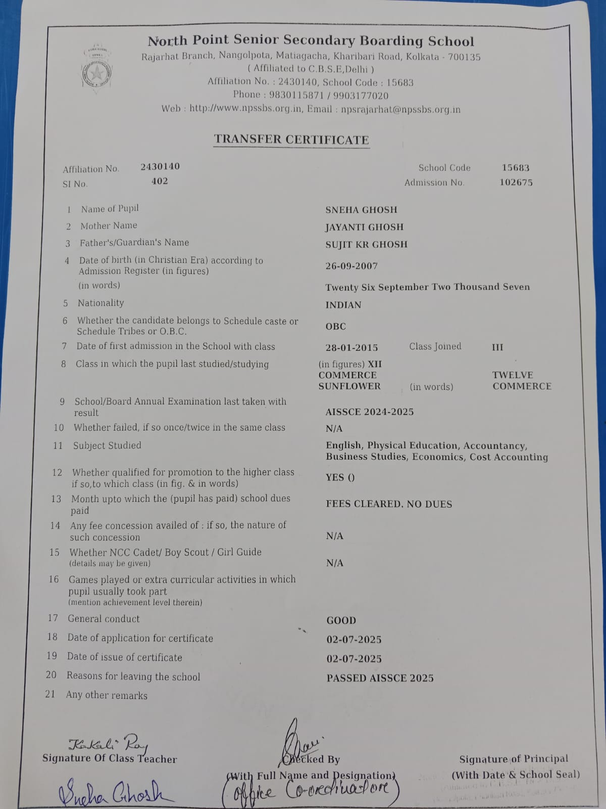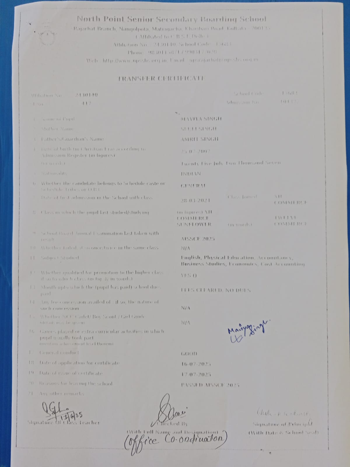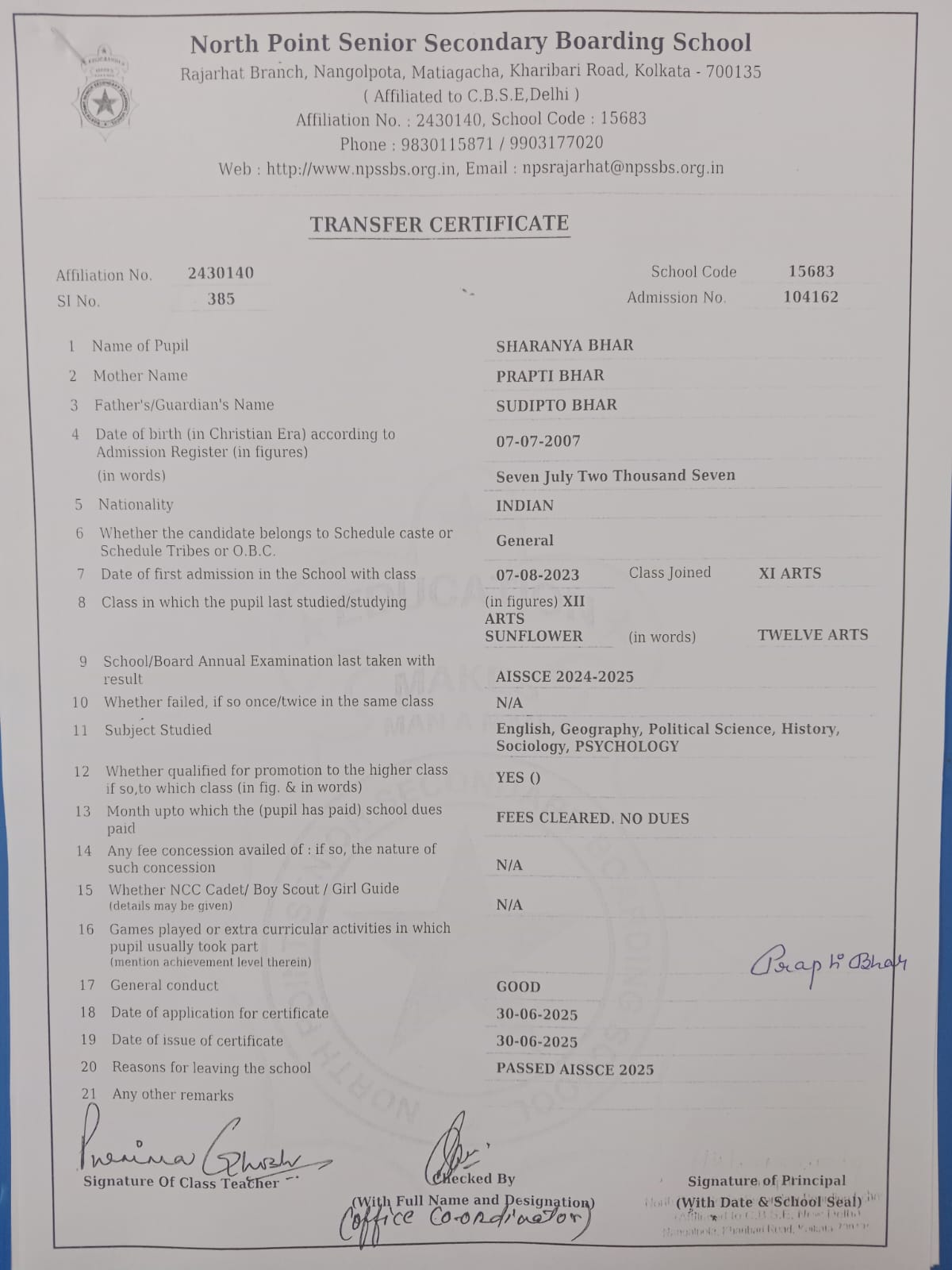 Transfer Certificate