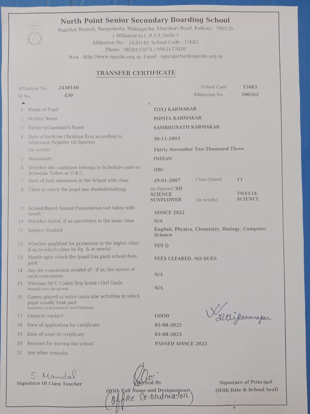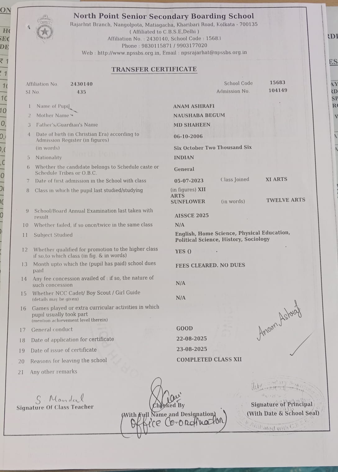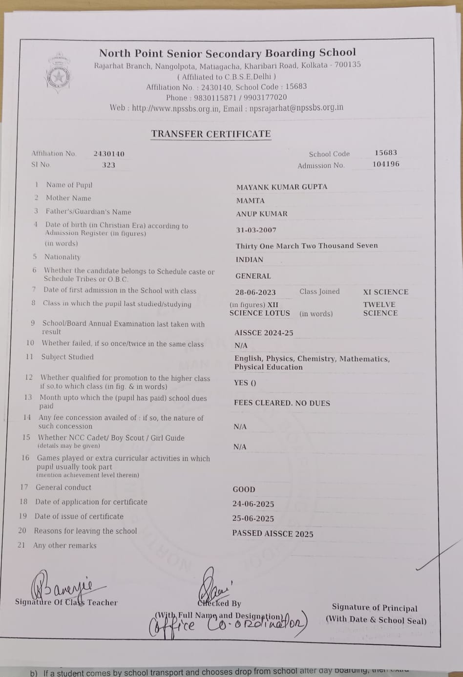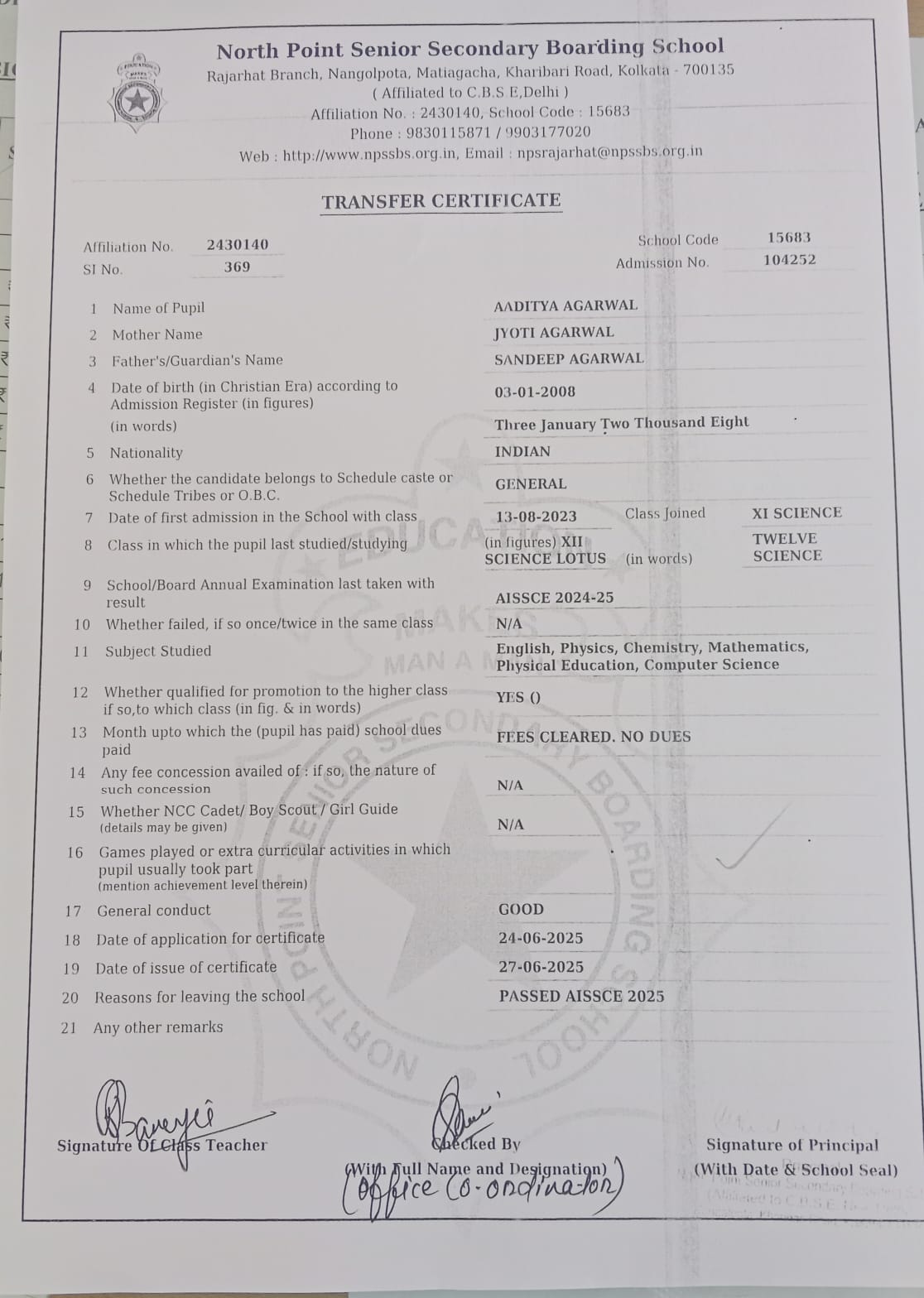 Transfer Certificate