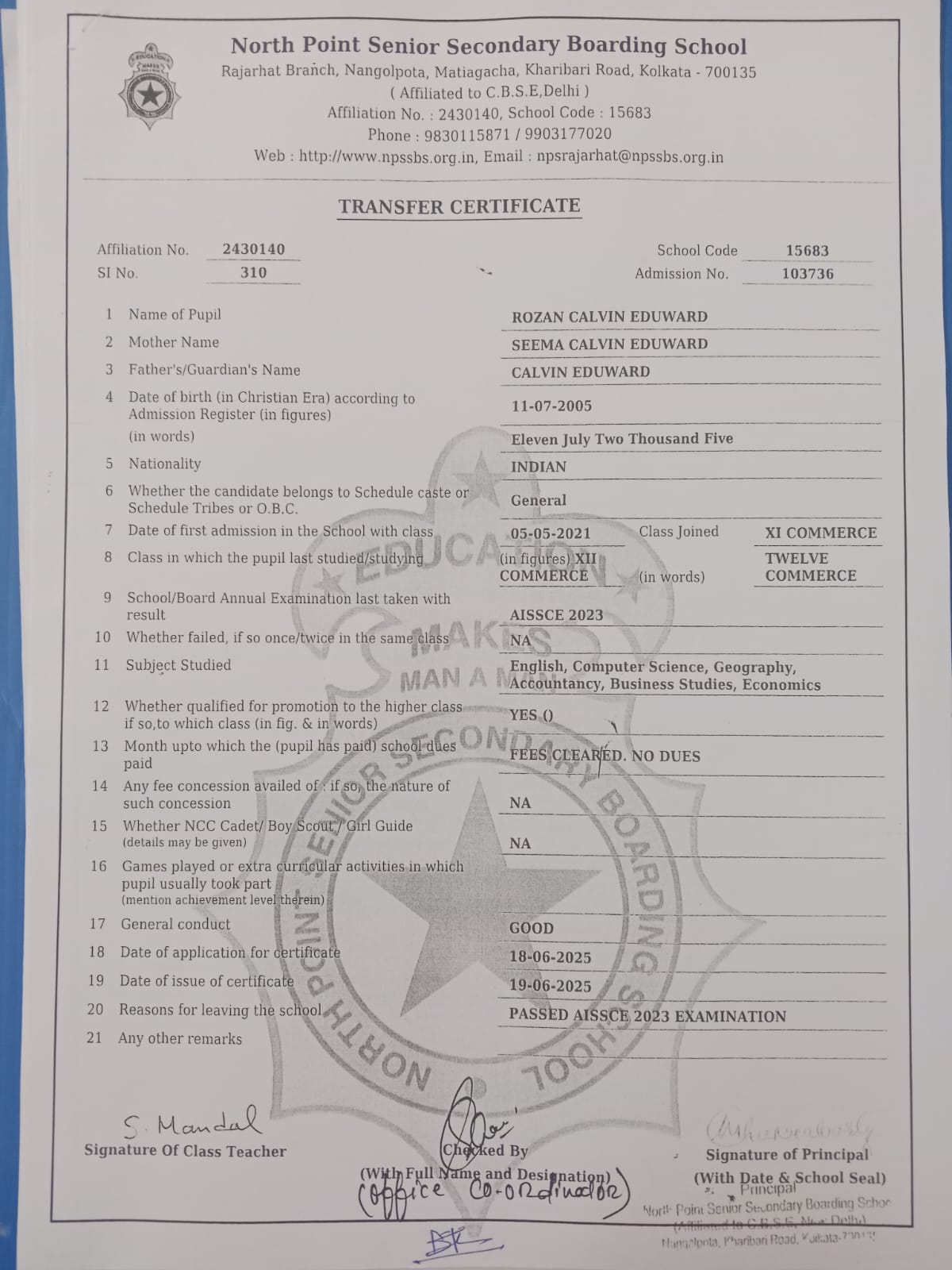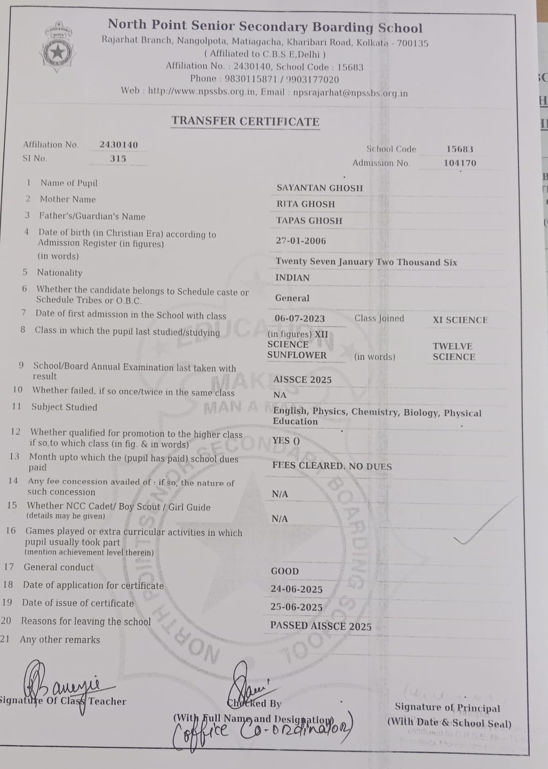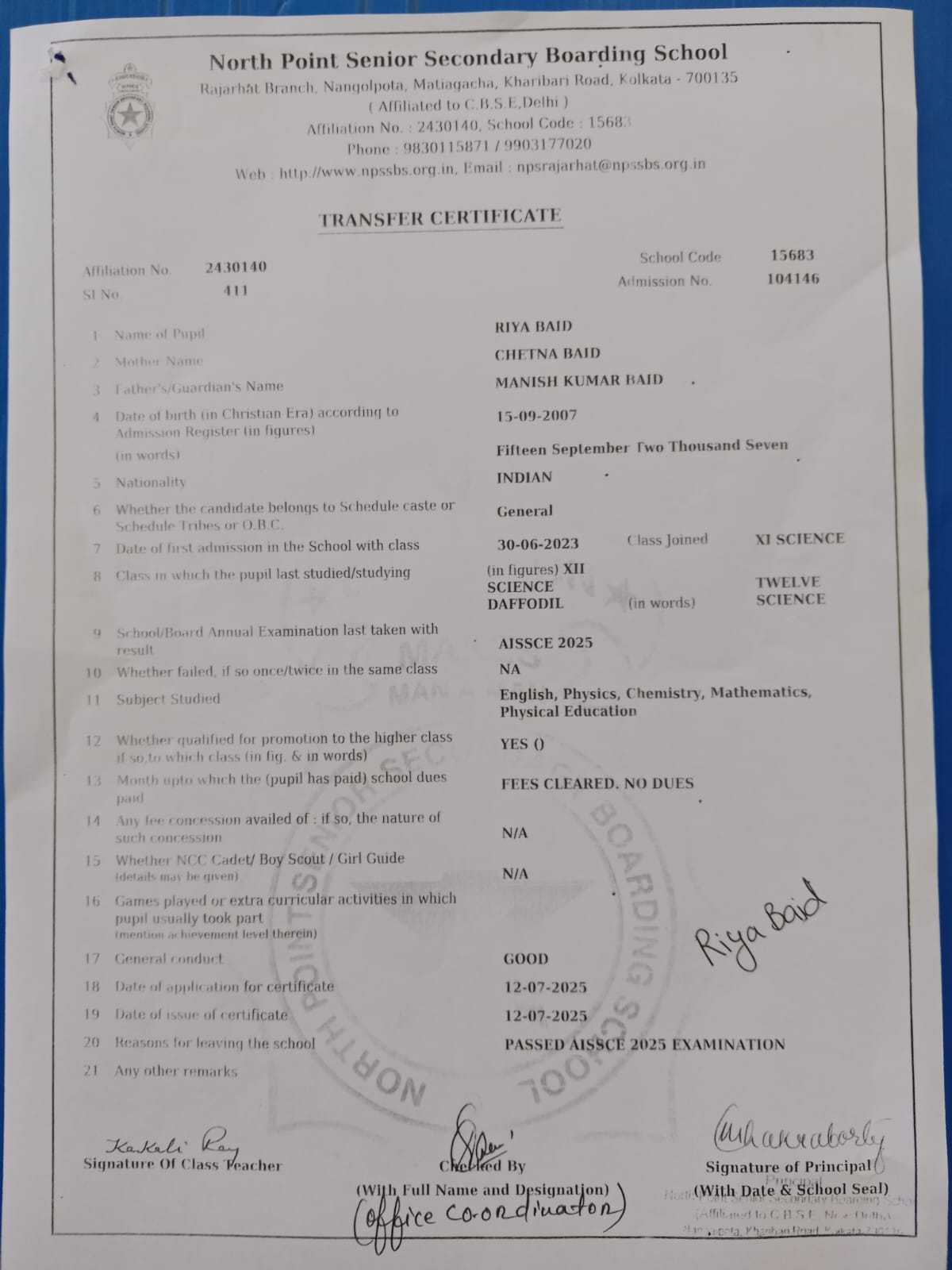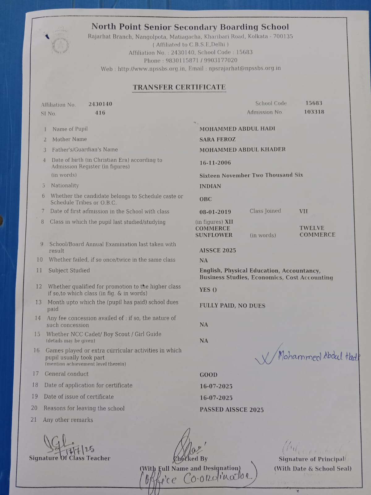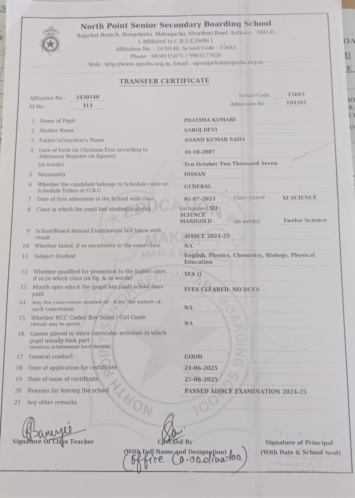 Transfer Certificate